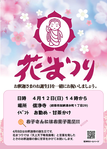 信浄寺では、4月12日(日)に花まつりのイベントを開催します。皆さん、一度遊びに来てください。お待ちしております。